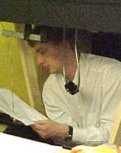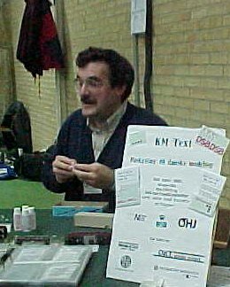 Klaus Kongsteder gået under bordet for at se på installationerne.I DMJK kort før udstillingen i Valbyhallen 2000 |
