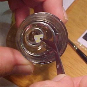 Brug destilleret vand, det pletter næsten ikke og vil også være nemmere at arbejde med i det hele taget. Hold mærket med din pincet - evt. i hjørnet - og dyp det i vandet ca 15-20 sekunder. Se ovenstående angående dyppetider. Dup mærket lidt af ved at lægge det på et stykke køkkenrulle. Efter ca 20-30 sekunder, længere ved større mærker, skulle det være begyndt at løsne sig. Tag mærket op igen med pincetten og læg det mellem tommel- og pegefinger på en anden hånd. Forskyd de to fingre en anelse mod hinanden, og mærket er nu smuttet en smule ud over kanten på papiret. På meget små mærker kan det være svært at gøre, men efter mange forsøg med andre metoder kan jeg selv kun bruge denne måde. Og mine fingre hører ikke til de små.....